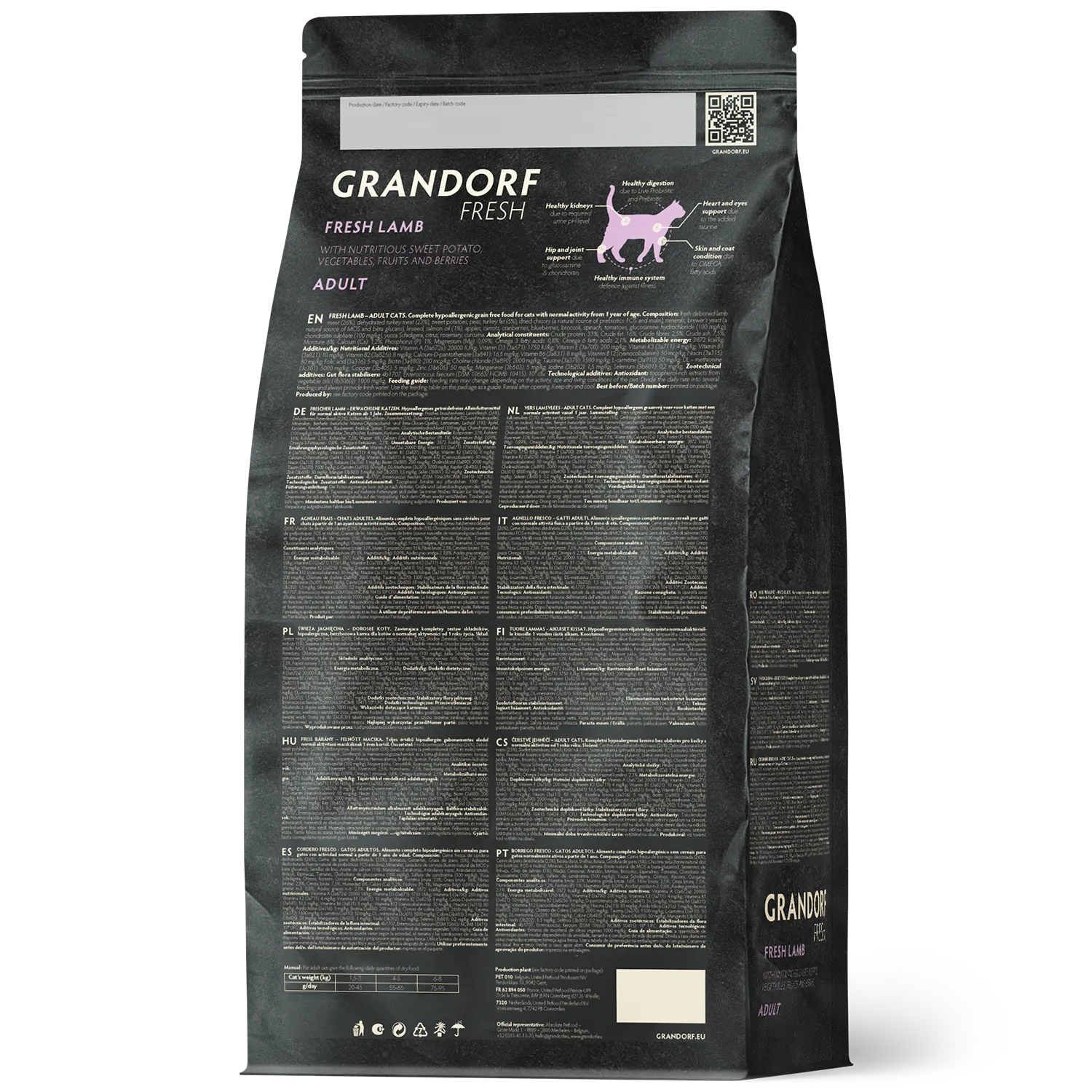 Свежее бескостное мясо ягненка (26%), Дегидрированное мясо индейки (23%), Батат, Горох, Жир индейки (5%), Порошок корней цикория (натуральный источник пребиотиков: FOS и инулин), Минералы, Пивные дрожжи (природный источник MOS и бета-глюканов), Льняное семя, Масло лосося (1%), Яблоки, Морковь, Клюква, Черника, Брокколи, Шпинат, Помидоры, Глюкозамина гидрохлорид (100 мг/кг), Хондроитина сульфат (100 мг/кг), юкка Шидигера, Грейпфрут, Розмарин, Куркума.