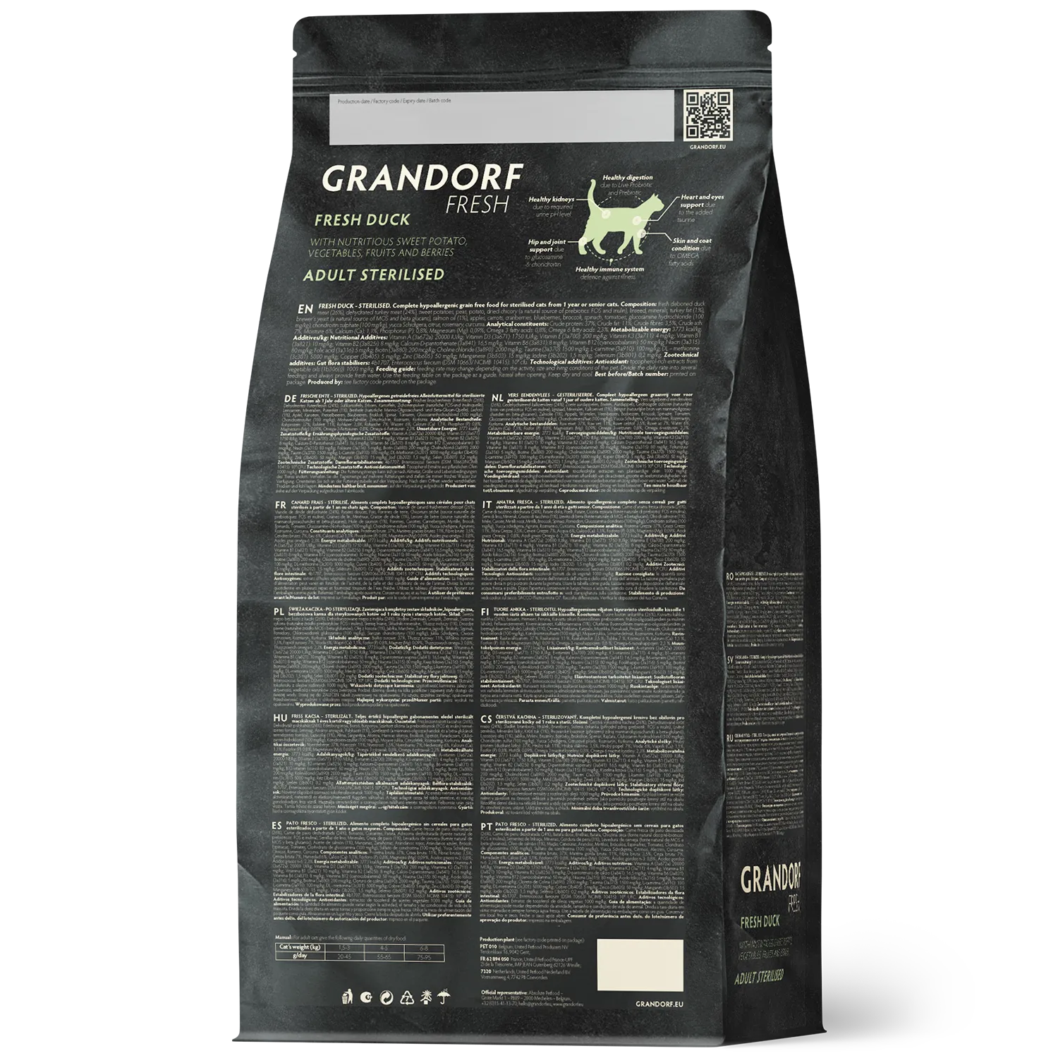 Свежее бескостное мясо утки (26%), Дегидрированное мясо индейки (24%), Батат, Горох, картофель, Порошок корней цикория (натуральный источник пребиотиков: FOS и инулин), Льняное семя, Минералы, Жир индейки (1%), Пивные дрожжи (природный источник MOS и бета-глюканов), Масло лосося (1%), Яблоки, Морковь, Клюква, Черника, Брокколи, Шпинат, Помидоры, Глюкозамина гидрохлорид (100 мг/кг), Хондроитина сульфат (100 мг/кг), юкка Шидигера, Грейпфрут, Розмарин, Куркума.