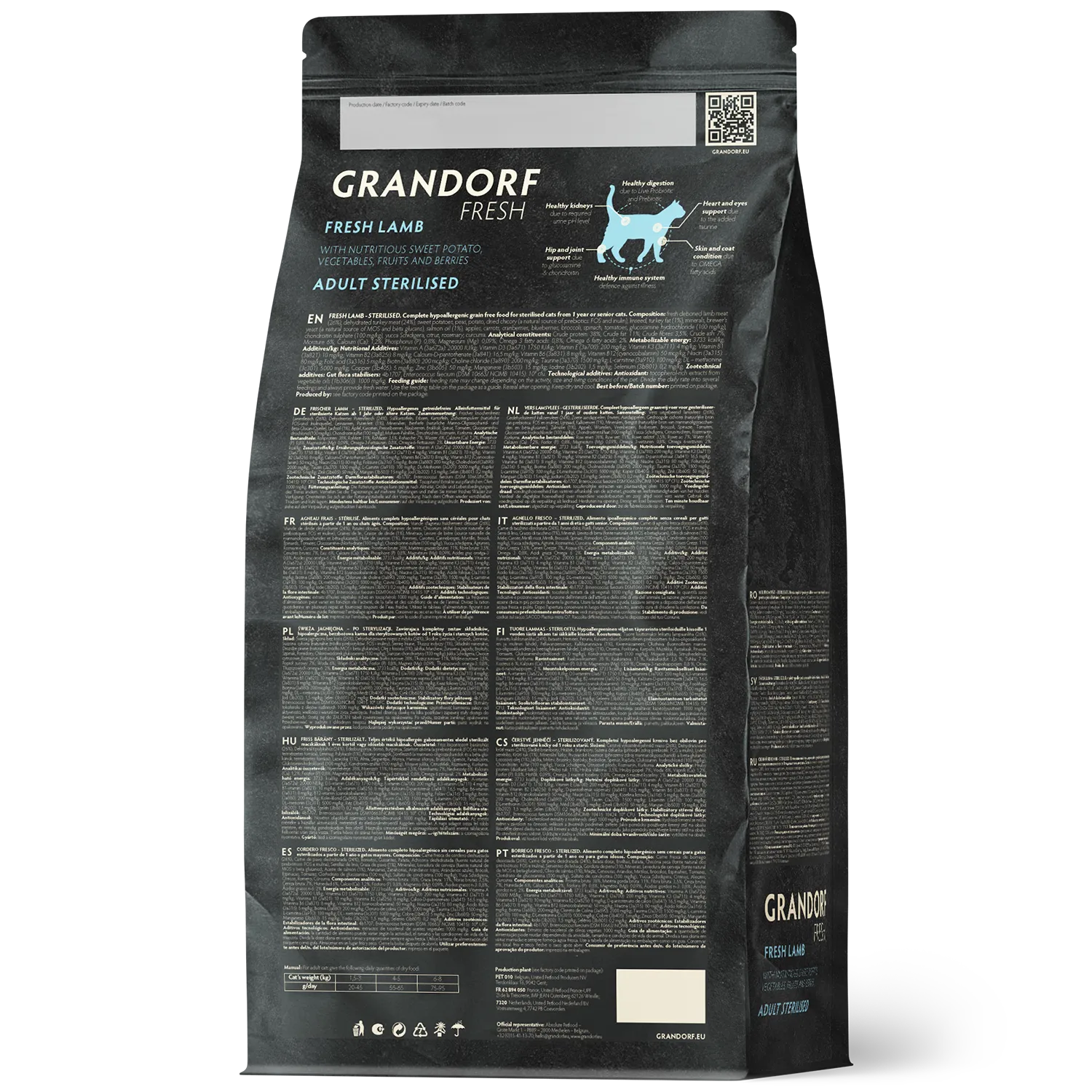 Свежее бескостное мясо ягненка (26%), Дегидрированное мясо индейки (24%), Батат, Горох, картофель, Порошок корней цикория (натуральный источник пребиотиков: FOS и инулин), Льняное семя, Жир индейки (1%), Минералы, Пивные дрожжи (природный источник MOS и бета-глюканов), Масло лосося (1%), Яблоки, Морковь, Клюква, Черника, Брокколи, Шпинат, Помидоры, Глюкозамина гидрохлорид (100 мг/кг), Хондроитина сульфат (100 мг/кг), юкка Шидигера, Грейпфрут, Розмарин, Куркума.