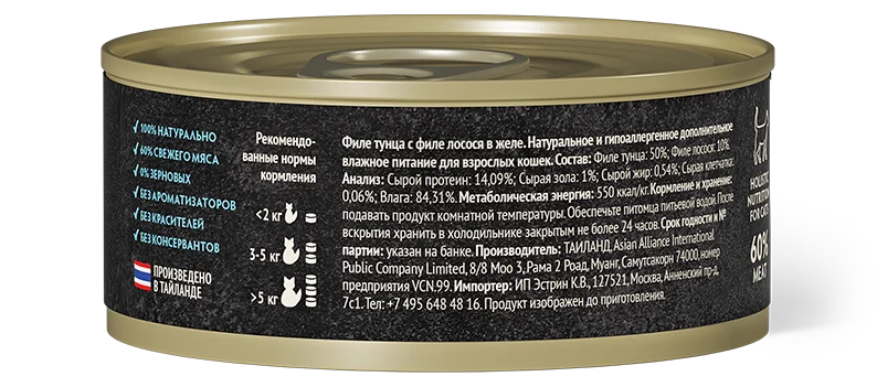 Филе тунца и лосося – источник Омега-3 жирных кислот, в том числе ДГК (докозагексаеновой) и ЭПК (эйкозапентаеновой), а также богатый источник белка с высокой степенью переваримости. Поразит даже самого искушенного питомца своим незабываемым вкусом и ароматом.