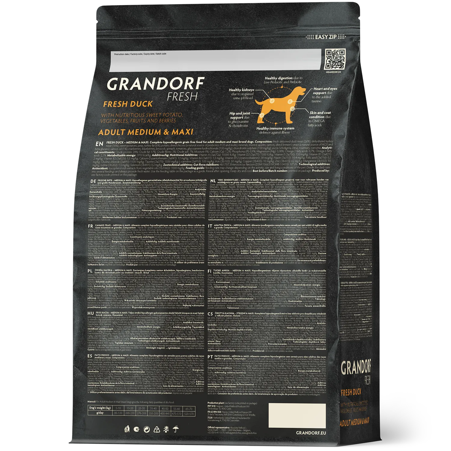 Свежее бескостное мясо утки (26%), Дегидрированное мясо индейки (18%), Батат, Горох, Жир индейки (6%), картофель, Порошок корней цикория (натуральный источник пребиотиков: FOS и инулин), Минералы, Льняное семя, Яблоки, Морковь, Пивные дрожжи (природный источник MOS и бета-глюканов), Масло лосося (1%), Клюква, Черника, Брокколи, Шпинат, Помидоры, Глюкозамина гидрохлорид (100 мг/кг), Хондроитина сульфат (100 мг/кг), юкка Шидигера, Грейпфрут, Розмарин, Куркума.