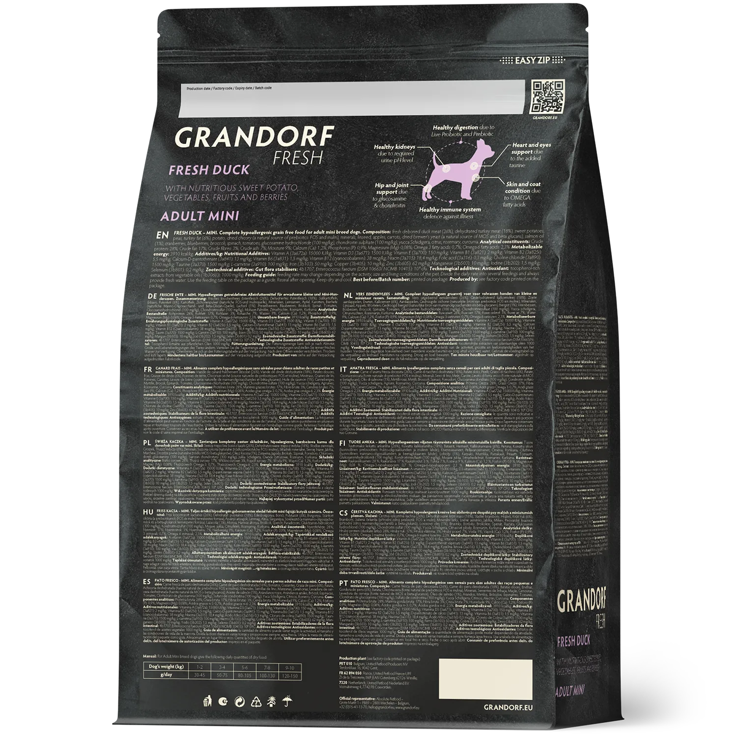 Свежее бескостное мясо утки (26%), Дегидрированное мясо индейки (18%), Батат, Горох, Жир индейки (6%), картофель, Порошок корней цикория (натуральный источник пребиотиков: FOS и инулин), Минералы, Льняное семя, Яблоки, Морковь, Пивные дрожжи (природный источник MOS и бета-глюканов), Масло лосося (1%), Клюква, Черника, Брокколи, Шпинат, Помидоры, Глюкозамина гидрохлорид (100 мг/кг), Хондроитина сульфат (100 мг/кг), юкка Шидигера, Грейпфрут, Розмарин, Куркума.