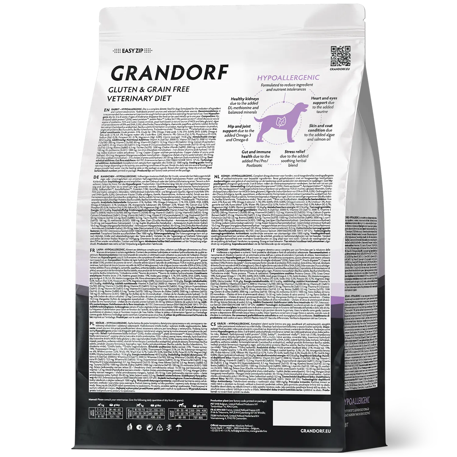Гидролизованный белок кролика* (25%), Батат**, Картофельные хлопья**, Жир индейки (13%), Картофельный белок*, Порошок корней цикория (натуральный источник пребиотиков: FOS и инулин), Льняное семя, Минералы, Гидролизованные дрожжи (природный источник MOS и бета-глюканов), Масло водорослей (натуральный источник ЭПК и ДГК) (0,5%), Травы сушёные (юкка Шидигера, ромашка, пассифлора, ромашка римская), Экстракт ферментации (Lactobacillus acidophilus), Сопутствующий продукт ферментации Bacillus subtilis, Сопутствующий продукт ферментации Aspergillus niger, Белок одноклеточных организмов (Bacillus subtilis, Bacillus licheniformis, Trichoderma viride). *Источник белка. **Источник углеводов.